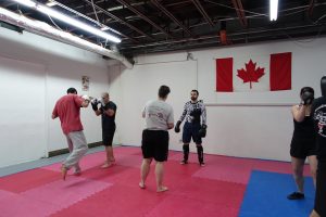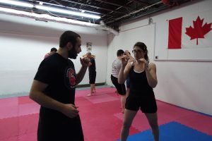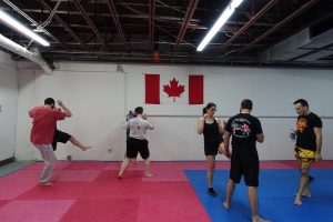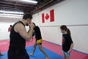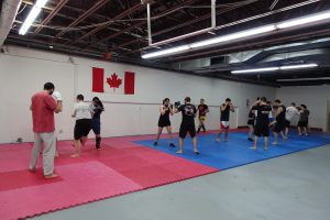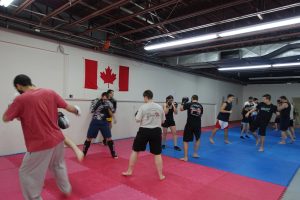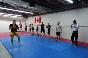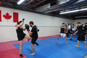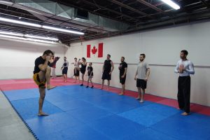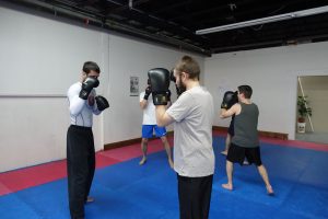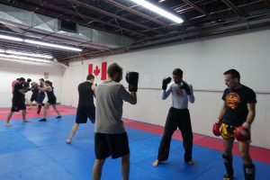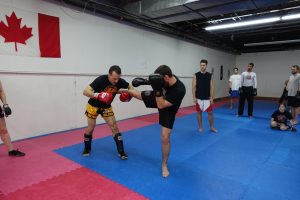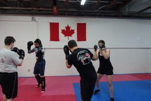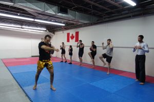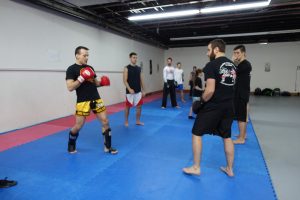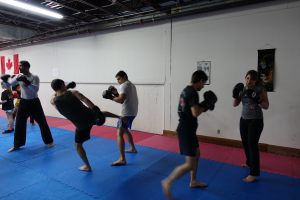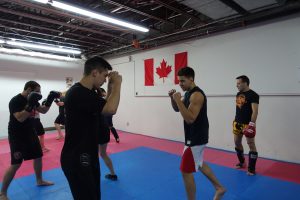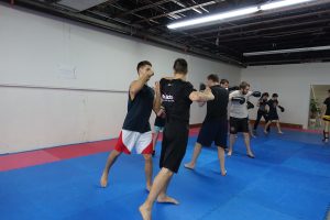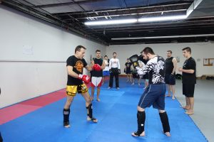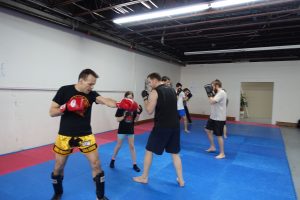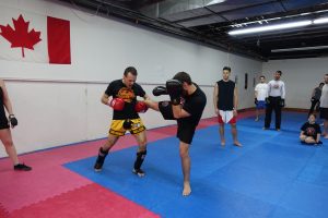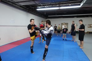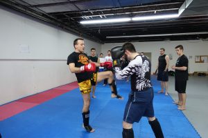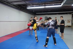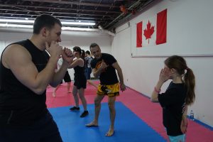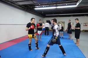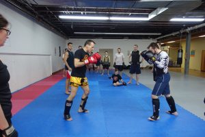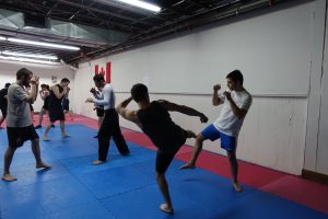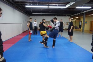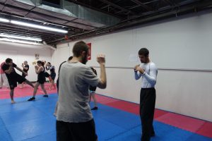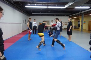 Apprentissage des combinaisons poings-pieds, des coups de genoux et des coups de coudes.